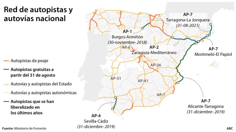 In 2020 werd de AP-7 tussen Tarragona (vanaf Salou) tot Alicante (afslag San Juan) tolvrij (373 km) en hoef je ook geen tol meer te betalen op de AP-4 tussen Sevilla en Cádiz (94 km). Het jaar daarvoor in 2018 werd de AP-1 (84 km) tussen Burgos en Armiñón in het noorden van Spanje al tolvrij.