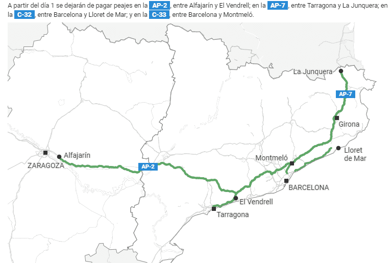 Vanaf middernacht 1 september 2021 wordt het mogelijk om gratis dus zonder het betalen van tol (peaje) over de snelweg naar de populaire Costa Brava, Costa Barcelona, Costa Dorada, Costa Azahar en Costa Blanca te rijden. In totaal worden meer dan 550 kilometer snelweg gratis wat de gebruiker tot bijna 29 euro kan schelen. Dit zijn de wegen, aantal kilometers en bedragen: