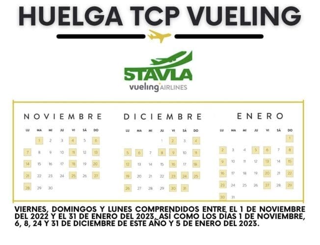 Omdat Vueling geen gehoor wil geven aan de eisen van de vakbond, ziet deze geen andere uitweg dan te gaan staken. Daarom zal het cabinepersoneel op vrijdagen, zondagen, maandagen en de feestdagen 1 november, 6, 8, 24 en 31 december en 5 januari het werk neerleggen. De periode is in totaal drie maanden lang en valt dus samen met de kerstdagen en de jaarwisseling, periodes waarin veel met Vueling gevlogen wordt.