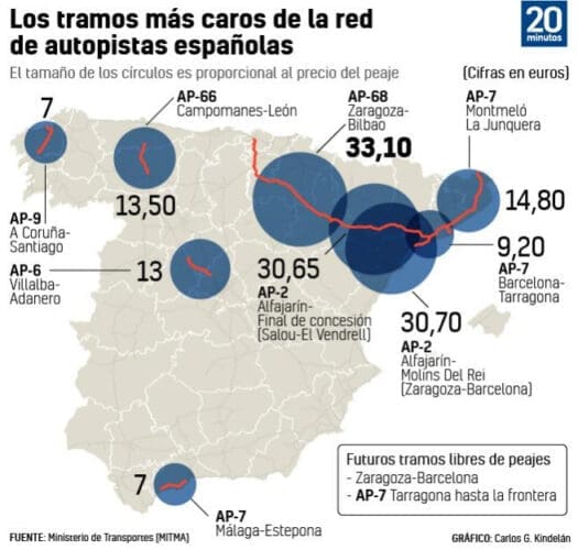 In september dit jaar (2021) komen daar de AP-7 tussen Montmeló en El Papiol in Catalonië; de AP-7 tussen Tarragona en La Junquera in Catalonië; de AP-2 tussen Zaragoza en El Vendrell aan de kust (Mediterráneo) bij omdat ook deze tolvrij worden.