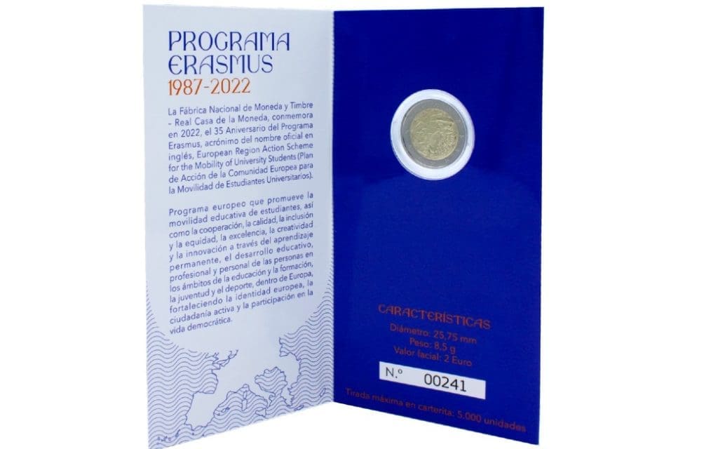 In 2022 bestaat het ERASMUS-programma in Spanje en andere Europese landen 35 jaar en ter herdenking werd een speciale 2-euromunt geslagen. Op de algemene/Europese kant staat de bekende twee euro tekening en aan de nationale kant een afbeelding van de Nederlander Desiderius Erasmus. Er staat een 35 op de nationale kant waar ook de tekst 1987-2022 Erasmus Programme staat met in het geval van Spanje ook España (iets wat bij de Nederlandse en Belgische versie niet op de munt staat).