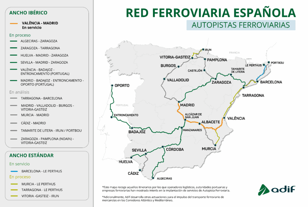 Spanje zet steeds sterker in op het combineren van spoor en weg voor goederenvervoer. De zogenoemde autopistas ferroviarias (letterlijk spoorautowegen) moeten duizenden vrachtwagens van de weg halen en zo uitstoot, files en slijtage aan het wegennet verminderen. De eerste route tussen Valencia en Madrid is al actief en een tweede, veel grotere verbinding tussen Algeciras, Madrid en Zaragoza is in volle ontwikkeling.