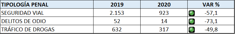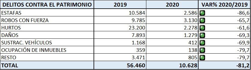 Wat betreft diefstal, fraude en overvallen daalde dit in Spanje met 81,2% naar een totaal van 10.628 strafbare feiten terwijl dat in 2019 er nog 56.460 waren. De grootste daling werd geregistreerd bij inbraak met 2.278 zaken (in 2019 waren dat er nog 23.200) en fraude met 2.586 zaken (in 2019 waren dat er nog 10.584).