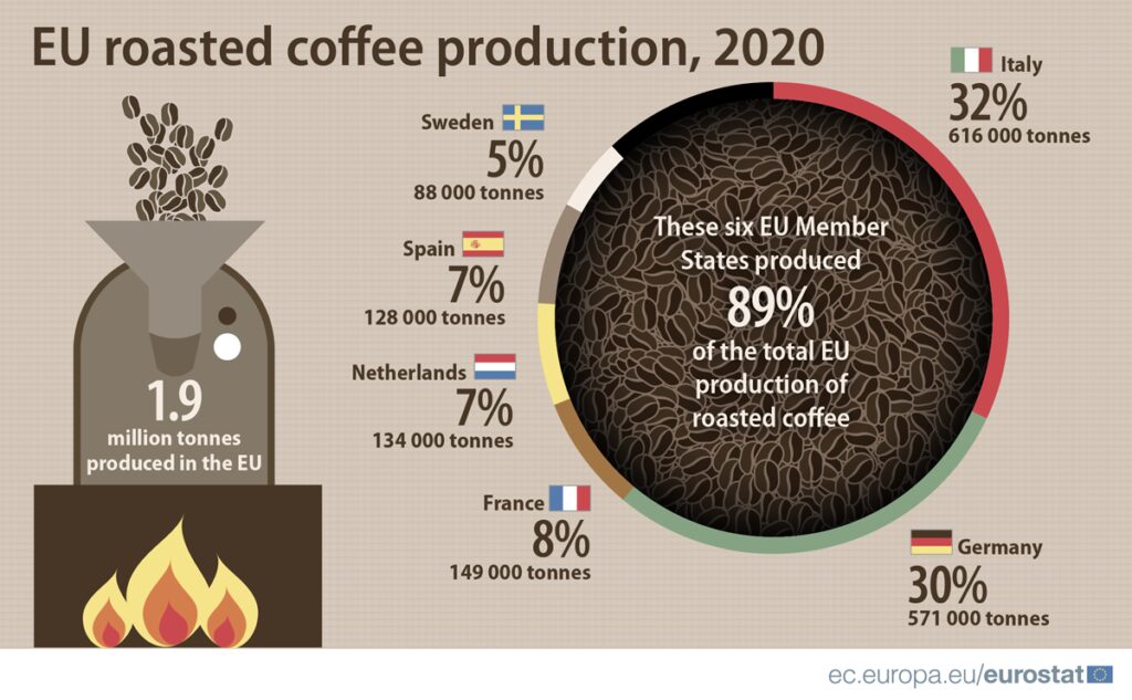 Van de EU-lidstaten produceerde Italië de meeste gebrande koffie in 2020 met 616.000 ton (32% van de totale EU-productie), gevolgd door Duitsland met 571.000 ton (30%), Frankrijk met met 149.000 ton (8%), Nederland met 134.000 ton (7%), Spanje met 128.000 ton (7%) en Zweden met 88.000 ton (5%). In 2020 produceerden deze zes EU-lidstaten 89 procent van de totale EU-productie van gebrande koffie. België staat met 41.000 ton op een negende plaats.