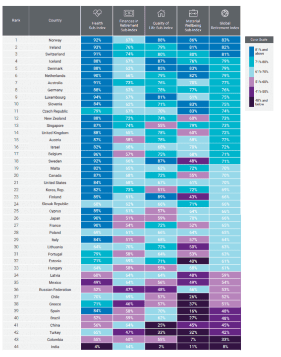 Spanje scoort relatief goed op het gebied van levenskwaliteit, met een 19e plaats in de index. Het milde klimaat, de rijke cultuur en de sociale levensstijl worden vaak genoemd als positieve aspecten voor gepensioneerden.