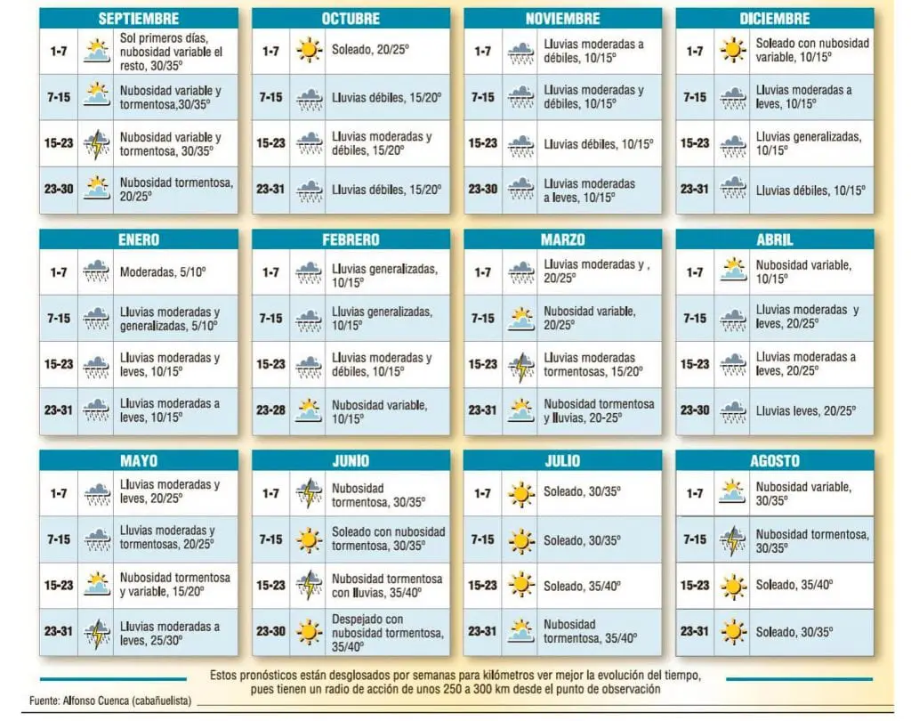 Vanaf 13 augustus begint de teller terug te lopen. 13 Juli verwijst opnieuw naar de maand Juli 1 jaar later, 14 augustus naar Juni, en zo terug naar af. Pepe Buitrago, ook bekend als de ‘Cabañuelo de Mula’ (een dorp in de provincie Murcia), is een bekende expert in het lezen van Las Cabañuelas. Vorig jaar voorspelde hij dat er een grote sneeuwstorm over Spanje zou neerdalen, wat ook gebeurde in de vorm van Filomena.