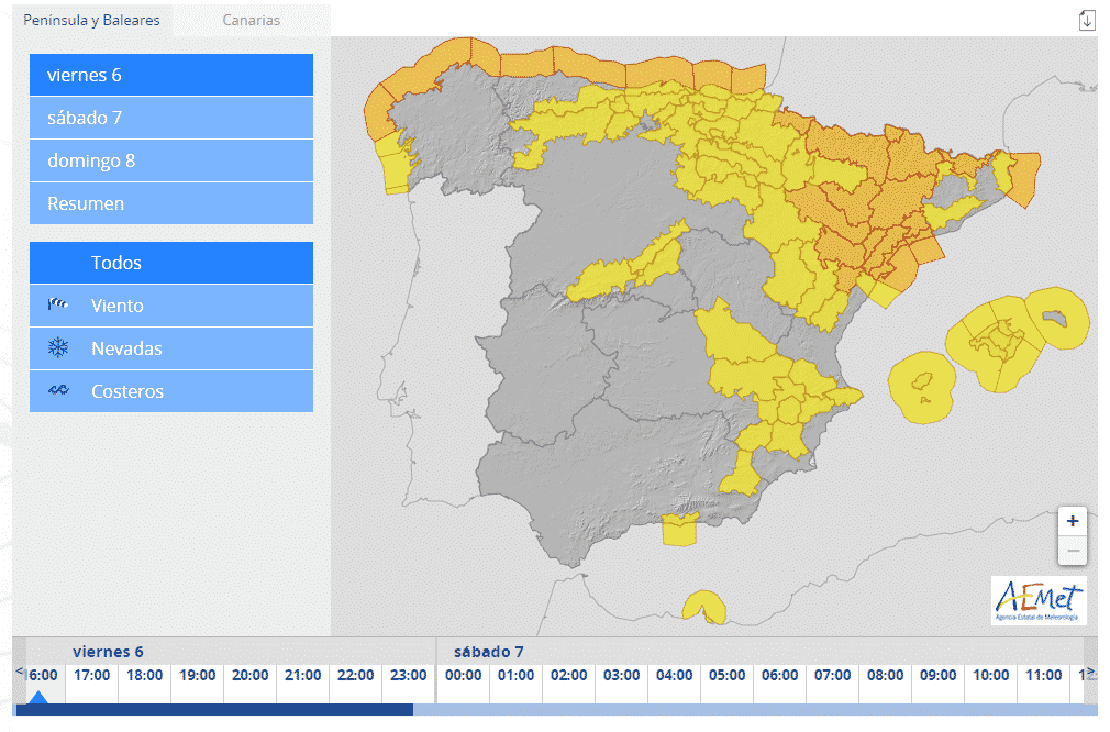 Vanwege de wind zullen de autonome regio’s Catalonië (Gerona en Tarragona), Balearen en de provincie Alicante in de regio Valencia te maken krijgen met een wilde zee en hoge golven. Op Ibiza en Formentera moesten de autoriteiten op vrijdag de havens sluiten.