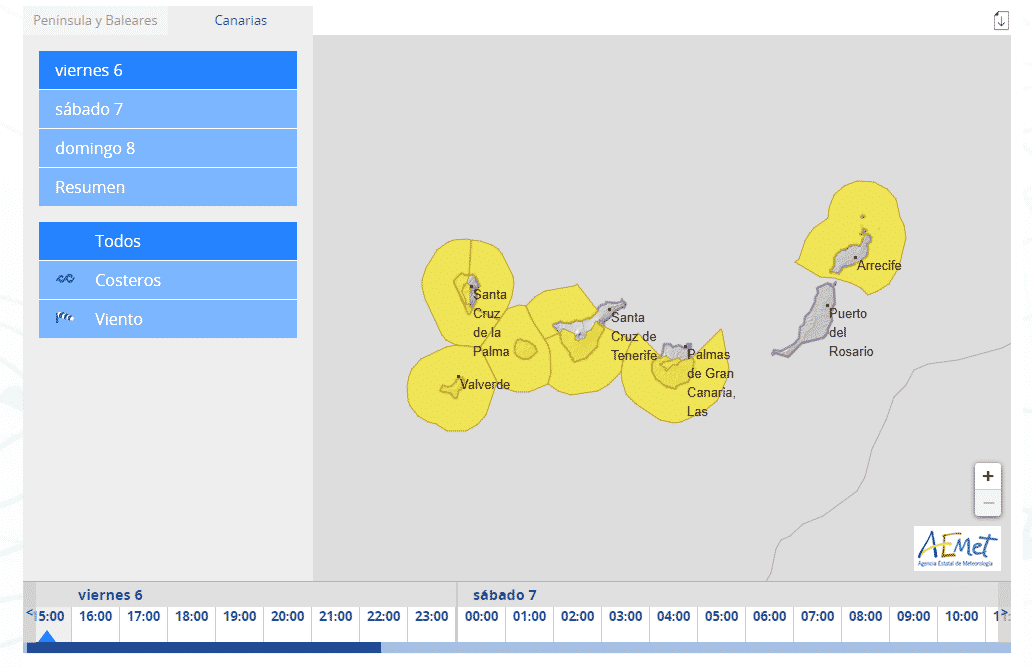 Ook op de Canarische Eilanden, met uitzondering van Fuerteventura, het noorden van Gran Canaria en het noorden van Tenerife, heeft men te maken met harde windvlagen waardoor de zee erg wild kan zijn. Vanaf zaterdagmiddag zal alleen Lanzarote nog te maken hebben met de harde wind.