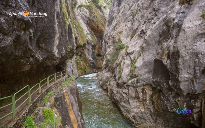 De route voert je door een dramatische kloof met aan weerszijden torenhoge kalkstenen wanden, terwijl de rivier de Cares ver beneden je bruist. De uitzichten zijn indrukwekkend, vooral wanneer de herfstkleuren de hellingen bedekken in goud, oranje en rood. Het contrast tussen de felgekleurde bladeren en de grijze rotsen is prachtig.