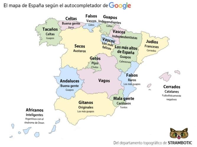 De inwoners van de regio’s in Spanje hebben een bepaalde naam en karakter, dat wil zeggen als je in Google zoekt naar catalanes, canarios of españoles dan vult Google deze zoekopdracht aan met veel gezochte zoektermen. Wat je doet is intoetsen “los españoles son…, los canarios son…” en dankzij de zoekvoorspellingen verschijnen en dan bepaalde eigenaardigheden zoals de volgende: