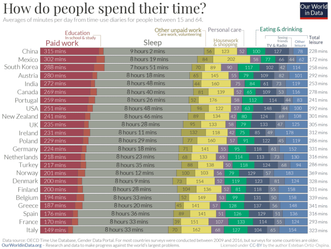 Er is gekeken naar de tijd die de inwoners van deze landen besteden aan betaald werk (paid work); onderwijs (education); slapen (sleep); ander onbetaald werk (other unpaid work); huishoudelijke taken en winkelen (housework & shopping); persoonlijke verzorging (personal care); eten en drinken (eating & drinking); TV & radio; vrienden (seeing friends); andere activiteiten (other leisure).