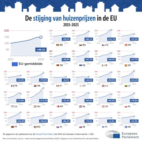 Volgens gegevens van het Europees Parlement is Hongarije het land met de sterkste stijging van de huizenprijzen; daar zijn de prijzen met maar liefst 172,5% gestegen. Portugal volgt met een toename van 105,8% tussen 2015 en 2023. Andere landen met significante stijgingen zijn Tsjechië en Estland, waar de prijzen ongeveer verdubbeld zijn in dezelfde periode.
