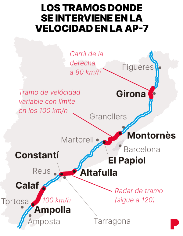 De 100 km/uur delen van de AP-7 snelweg worden gerealiseerd op die plaatsen waar veel ongelukken plaatsvinden zoals in ter hoogte van de Ebro-delta, Tarragona, Vallés en de Ronda Girona waarbij het totaal om 83 kilometer gaat. De 100 km/uur delen komen tussen Calafat en L’Ampolla in het zuiden van de provincie Tarragona, in de Vallès streek waar de AP-7 aansluit op de B-23 weg en daar waar de snelweg aansluit op de C-33 richting Montornès del Vallès.