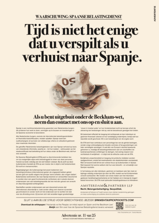 Het internationale advocatenkantoor Amsterdam & Partners, dat kantoren heeft in Londen en Washington, is een ongekende strijd aangegaan tegen de Spaanse belastingdienst, de Agencia Tributaria. Het kantoor beschuldigt de Spaanse belastinginspecteurs in de internationale media zelfs van ‘diefstal’ en is voornemens om nieuwe mediacampagnes op te zetten. Met deze campagnes willen ze aantonen dat de Spaanse fiscus haar eigen ethische richtlijnen overtreedt door buitenlandse belastingbetalers onterecht te vervolgen.