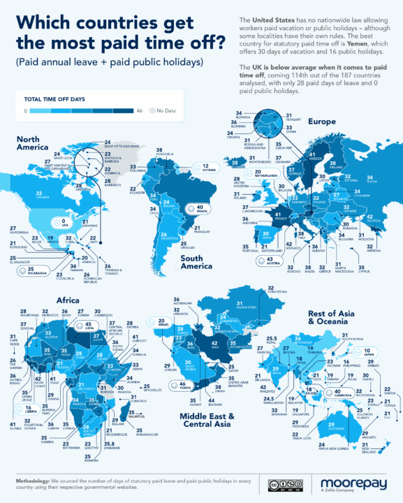 In Nederland ligt het wettelijke minimum op 20 betaalde vakantiedagen per jaar. Sommige werkgevers geven er meer: gemiddeld tussen de 25 en 30 dagen, maar het minimum blijft bescheiden. Daarbij komen ongeveer 8 betaalde feestdagen, wat het laagste aantal in West-Europa is.