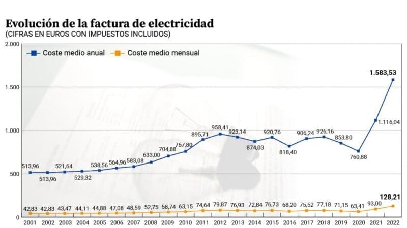 De jaarlijkse elektriciteitsrekening in 2022 is de hoogste ooit geregistreerd in Spanje. Gedurende 2022 werden ook de drie duurste maandrekeningen ooit geregistreerd omdat de gemiddelde elektriciteitsrekening in maart 176,73 euro bedroeg, in augustus 158,30 euro en in juli 142,40 euro.