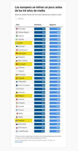 Volgens de onderstaande tabel op de website van de krant eldiario.es, waarbij gekeken is naar de cijfers van het Ageing Report 2021 van de Europese Commissie, blijkt dat de gemiddelde effectieve pensioenleeftijd in de Europese Unie 63,8 jaar voor mannen en 63 jaar voor vrouwen is.