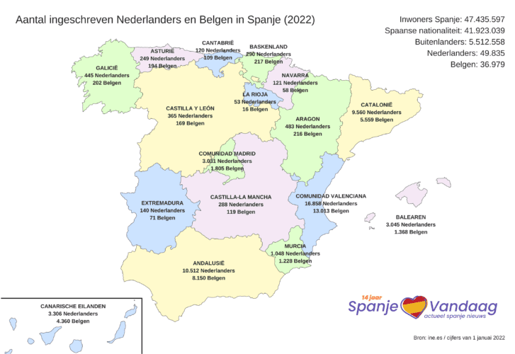 Het totaal aantal ingeschreven (empadronados) Nederlanders en Belgen is in 2022 gestegen naar 86.814 (+6.025). Het aantal Belgische (ingeschreven) inwoners steeg van 34.383 begin 2021 naar 36.979 (+2.596) inwoners begin 2022. Het aantal Nederlandse (ingeschreven) inwoners steeg van 46.406 begin 2021 naar 49.835 (+3.429) inwoners begin 2022.