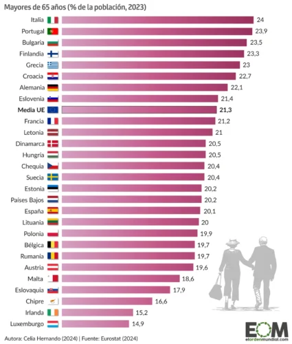 Deze demografische verschuiving is vooral merkbaar in Zuid-Europese landen zoals Italië, waar 24% van de bevolking ouder is dan 65 jaar, gevolgd door Portugal (23,9%) en Griekenland (23%). Ook Bulgarije (23,5%) en Finland (23,3%) hebben een aanzienlijk aandeel ouderen. Aan de andere kant hebben landen als Luxemburg, Ierland en Cyprus de laagste percentages ouderen, met minder dan 17% van de bevolking boven de 65 jaar.