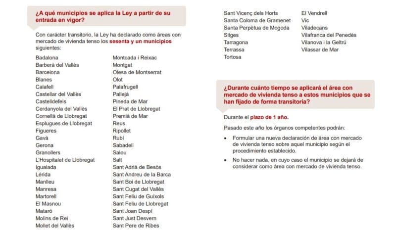 Enkele van de grotere steden die zijn opgenomen in de lijst zijn Barcelona, Girona, Lleida, Mataró, Sabadell, Terrassa, Tarragona en Reus. Deze steden hebben de afgelopen jaren een aanzienlijke stijging van de huurprijzen ervaren, wat heeft geleid tot huisvestingsproblemen voor veel inwoners.