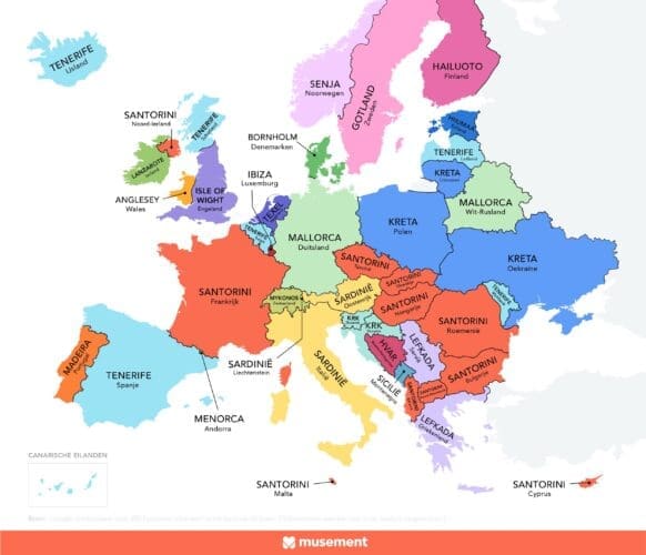 Met dat in het achterhoofd heeft Musement, het digitale boekingsplatform voor activiteiten over de hele wereld, een kaart van Europa gecreëerd met daarop de favoriete eiland-bestemmingen van 44 Europese landen. Om te weten te komen welk Europees eiland het populairst is in elk land, werd het Google-zoekvolume voor 200 Europese eilanden (exclusief eilandstaten) in de aanwezige landen geanalyseerd.