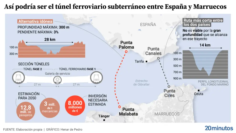Als de tunnel in 2050 in gebruik is worden jaarlijks meer dan 12,8 miljoen passagiers verwacht en schat men dat er 3 miljoen ton aan goederen door de tunnel getransporteerd worden. Het kostenplaatje wordt nu geschat op 8 miljard euro, dat deels door Spanje, Marokko en de Europese Unie betaald moet worden. De bouw van de toekomstige tunnel is opgedeeld in twee fasen.