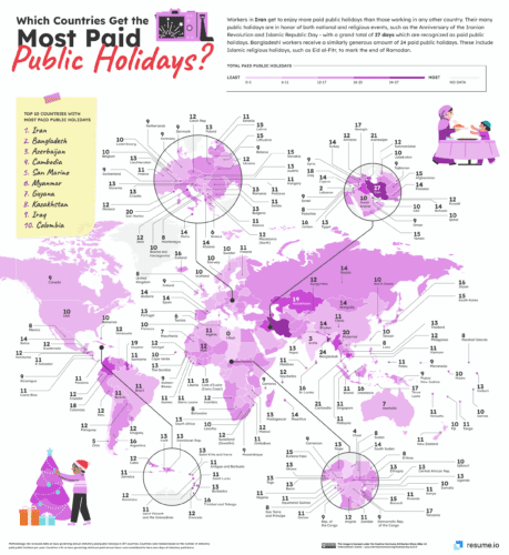 Iran staat bovenaan met het hoogste aantal betaalde verlofdagen (53 in totaal). Opvallend genoeg bevindt de Verenigde Staten zich echter onderaan de lijst met slechts 10 betaalde feestdagen.
