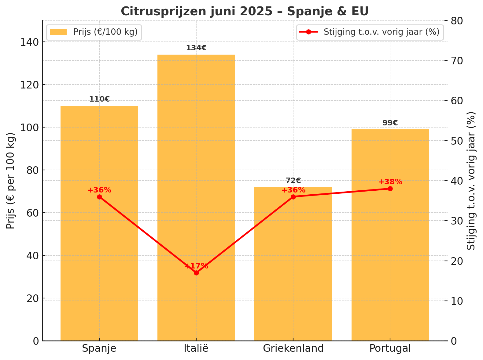 Het is deze zomer flink duurder geworden om citrusfruit te kopen in Spanje én in de rest van Europa. Volgens de nieuwste cijfers van het Europese Citrus Dashboard kostte een honderd kilo sinaasappels in juni gemiddeld 110 euro. Dat is 36 procent meer dan een jaar geleden en ruim 30 procent boven het gemiddelde van de afgelopen vijf jaar.