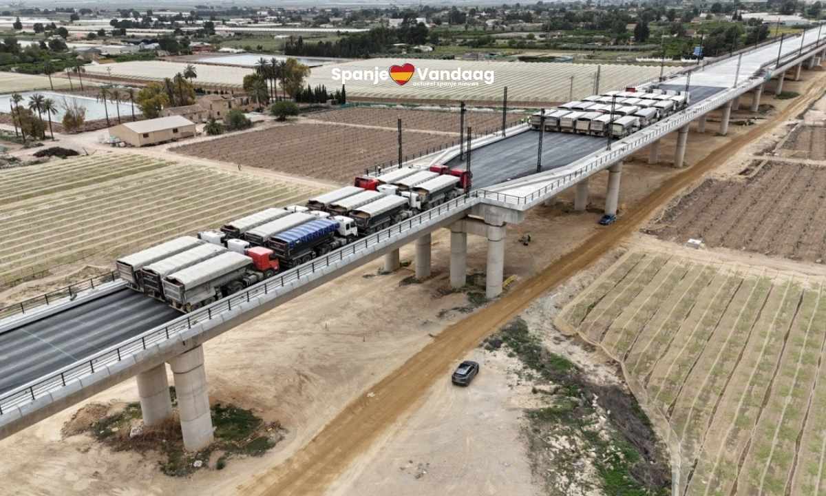 Zware vrachtwagens testen nieuw hogesnelheidstrein viaduct in Murcia tot het uiterste
