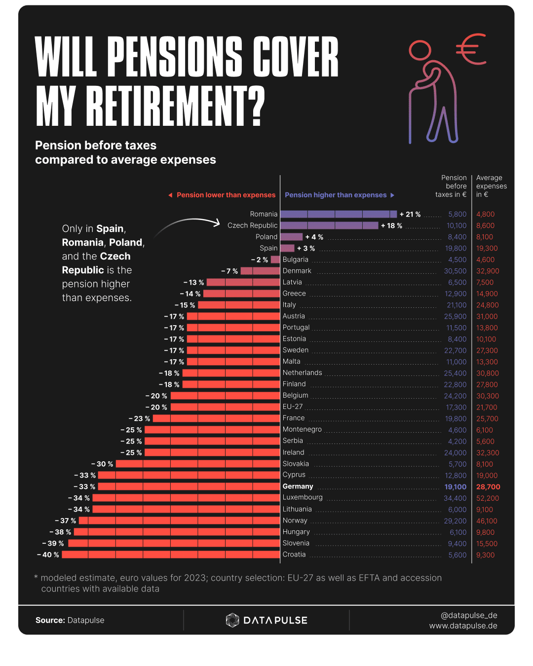 Uit het onderzoek blijkt dat naast Spanje alleen Roemenië, Tsjechië en Polen een gemiddeld pensioen hebben dat in verhouding staat tot de kosten van levensonderhoud. Vooral onder de vier grootste economieën van de EU, Duitsland, Frankrijk, Italië en Spanje, springt Spanje eruit als enig land waar gepensioneerden met een gemiddeld pensioen in principe hun basisuitgaven kunnen betalen.