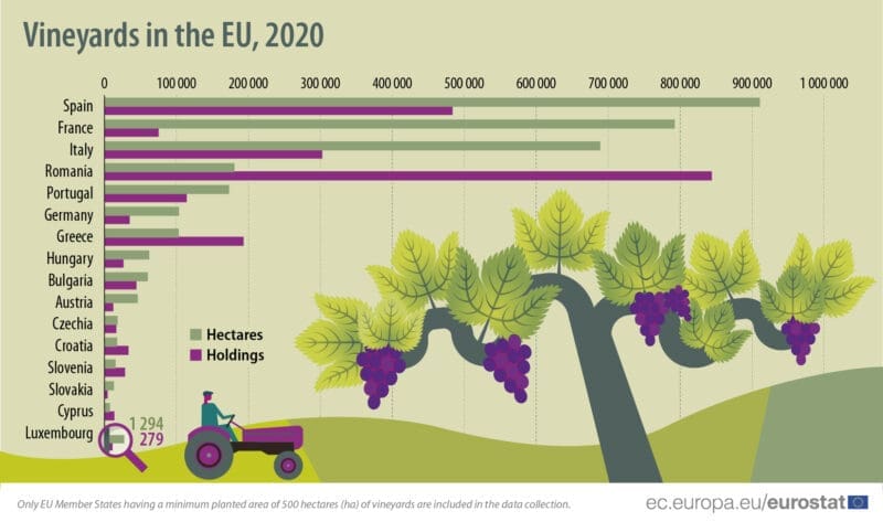 Spanje, Frankrijk en Italië waren samen goed voor driekwart (74,9%) van het wijnbouwareaal in de EU en ongeveer twee vijfde (38,7%) van de wijnbouwbedrijven in 2020. Roemenië had echter het hoogste aantal wijnbouwbedrijven in de EU (0,8 miljoen bedrijven, wat overeenkomt met 37,9% van het EU-totaal in 2020).