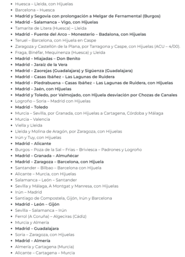 Het gaat daarbij niet om alle routes en dus ook niet voor alle reizigers, maar wel om de belangrijkste routes zoals: Madrid en Segovia; Guadalajara en Madrid; Teruel en Barcelona; Zaragoza en Castellón de la Plana; Jaén en Madrid; Gijón en León; Irún en Tui of Logroño en Soria. Zie de lijst onderaan dit artikel voor alle 42 routes die voor frequente reizigers gratis zullen zijn in 2023.