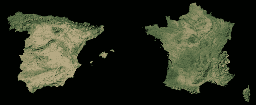 Spanje heeft (volgens deze website) een oppervlakte van 494.005 km² ten opzichte van Frankrijk met 543.119 km². In Spanje wonen 46.293.323 inwoners terwijl dit in Frankrijk 62.814.233 inwoners is. De bevolkingsdichtheid per km² in Spanje is 94, maar dat is in Frankrijk 116.