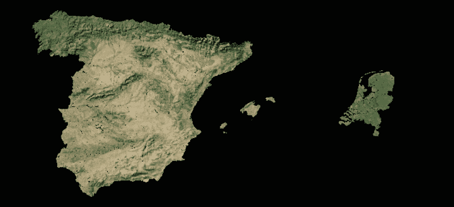 Spanje is wat betreft oppervlakte ongeveer 12 keer groter dan Nederland en in het geval van België is Spanje ongeveer 16 keer groter. Maar dat klinkt allemaal leuk en aardig, maar hoe ziet dat er dan uit, in welke verhouding moeten we Spanje, Nederland en België zien.