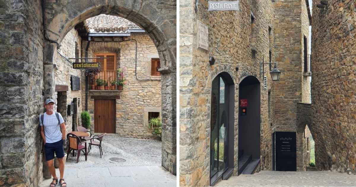 We bevinden ons in Aínsa, een middeleeuws dorp in Huesca dat, zo wordt beweerd, één van de mooiste enclaves is van de Pyreneeën. Het dorp staat trouwens ook op het lijstje van ’Los pueblos más bonítos de España’ en nu is het toch al wel een tijdje geleden dat we er zo eentje zijn tegengekomen. Naast deze roemrijke vermelding is dit dorp ook een ideale uitvalsbasis om het Parque Nacional Ordesa y Monte Perdido te gaan bezoeken, iets wat wij al net iets eerder mochten doen. Hier tref je nog intacte stadsmuren aan, een monumentaal castillo, geplaveide straten, historische huizen, kerken en uiteraard verschillende plazas. Bovendien komt ook de Bourgondiër hier best aan zijn trekken. Uiterst smakelijk eten doe je bij ’Callizo’, een Michelin sterrenrestaurant waarvan vandaag de deuren nog op slot blijken te zijn. Erg vinden we dit niet, want wie kiest voor een leven van reizen zonder werken, zou achteraf misschien alleen maar zijn broek scheuren aan een exuberante rekening. Hoe hemels en verfijnd het daar ook mag zijn, wij zijn al lang tevreden met klassiekers zoals tapas of beter nog, een eenvoudige menú del día. Toch tuur ik even naar binnen door het raam. Het prachtige interieur ziet er meer dan ’Michelinwaardig’ uit, even geraffineerd als de smaken van de opgediende gerechtjes, die wat mij betreft, toch steeds alleen maar te klein uitgevallen lijken te zijn…