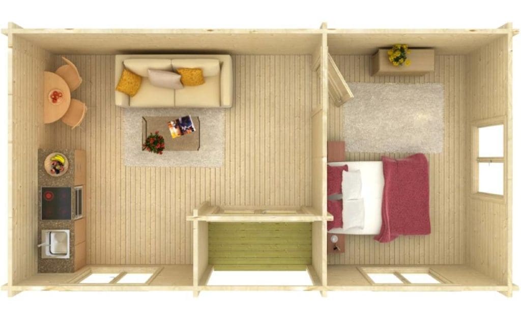 Voor wie wat minder plaats en budget heeft, is er ook het model Sandra. Sandra is al beschikbaar vanaf 13.090 euro en is in totaal 21,5 vierkante meter groot, met vooraan nog een terras van 3,7 vierkante meter. Er zijn twee slaapkamers, en een keuken met eetzaal.