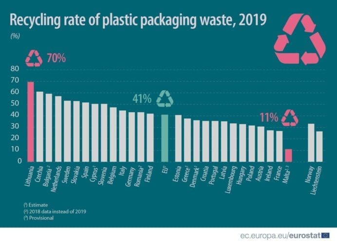 In 2019 werd in de EU naar schatting 41% van het plastic verpakkingsafval gerecycled. Negen EU-lidstaten recyclen meer dan de helft van het geproduceerde plastic verpakkingsafval: Litouwen (70%), Tsjechië (61%), Bulgarije (59%, gegevens over 2018), Nederland (57%), Zweden en Slowakije (beide 53% ), Spanje (52%), Cyprus (51%) en Slovenië (50%).